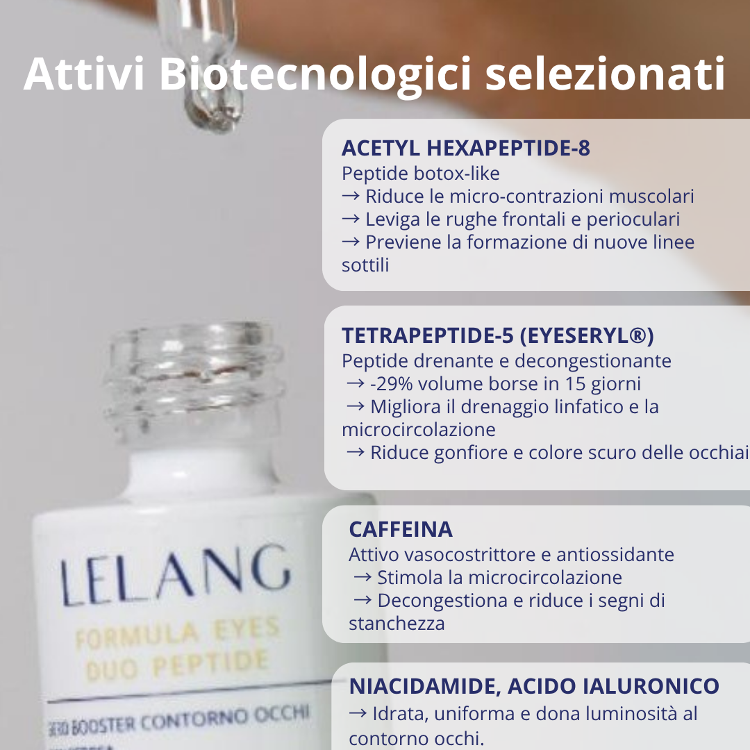 Ideale per Tutti i tipi di pelle. Contiene: Acetyl Hexapeptide-8; Peptide Tetrapeptide-5, Acido Ialuronico, Caffeina, Niacinamide; Aloe Vera Bio.